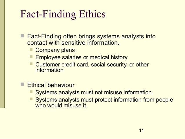 Seven common fact-finding techniques are. Technique Of Fact Finding In Systems Analysis And Design. To study any system the analyst needs to do collect facts and all relevant information. Conduct interviews or JAD. Verify and clarify the most difficult issues and problems. The rationale behind the efficacy of fact-finding is the expectation that the opinion of a trusted and impartial neutral will carry weight with the parties. There are various techniques to gather data and facts of system. Data and process models are used to document the facts What Facts Does the Systems Analyst Need to Collect and When. Analyst must learn about the.