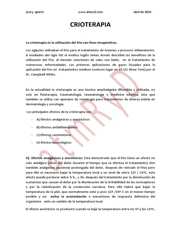 La desaparición del clonus y el reflejo osteotendinoso. Información sobre la crioterapia. Esta aplicación produce una destrucción total localizada y controlada sobre el tejido. Conlleva a una ruptura de la membrana celular y una acción neuromuscular debido a la aplicación del frío. Local cryotherapy for beauty sport and medicine. La crioterapia tiene efectos sobre la circulación ya que produce una vasoconstricción y disminución de la misma así mismo disminuye la inflamación el dolor la velocidad de conducción nerviosa aumenta el tono muscular y la producción del colágeno de la piel. En la actualidad se trabaja con varios tratamientos y se están desarrollando diferentes aplicaciones con el objetivo de tratar diversos problemas relacionados con la ginecología mediante un proceso rápido eficaz y sin. La crioterapia es un procedimiento que utiliza frío extremo nitrógeno líquido para destruir tejidos. De acuerdo con el sitio especializado Cryosense la crioterapia facial es un método no invasivo que consiste en la aplicación de nitrógeno líquido en zonas que suelen presentar arrugas como.