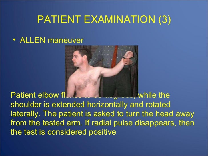 The examiner then removes the pressure from one artery. The patient may also have subjective complaints of swelling either permanent or intermittent. If playback doesnt begin shortly. A negative Allens test safely selects patients for radial artery harvest although the cut-off point is controversial. Costoclavicular syndrome is a neurovascular entrapment syndrome caused by a decrease of the costoclavicular space between the. B Scalene muscle test in thoracic outlet syndrome. Discuss the uses of allens test and where it is used how it is done.
