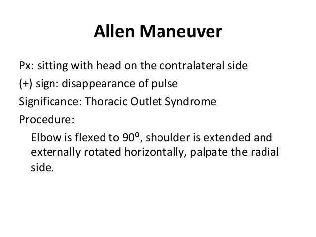 There are some tests out there that have false positives and this is one of the. Allen Test or Allens Test or Allen Maneuver or Write Test is a common test done during the examination of the shoulder for the presence of Thoracic Outlet Syndrome TOS. Thoracic outlet syndrome TOS is a condition in which there is compression of the nerves arteries or veins in the passageway from the lower neck to the armpit.