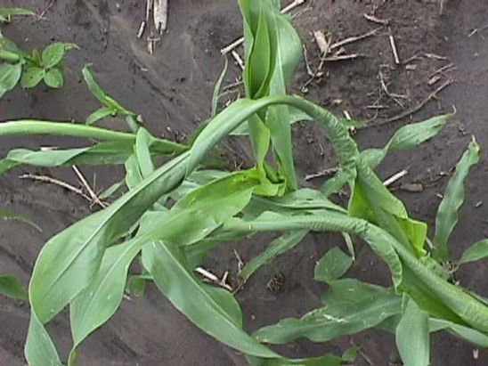 The new leaves are trapped and unable to emerge causing the whorl to twist and bend from the resulting pressure. Rapid growth syndrome RGS describes a situation where random plants across a corn field exhibit tightly rolled upper plant leaves that do not unfurl normally. The whorl will often be bright yellow in color and very noticeable in the field.