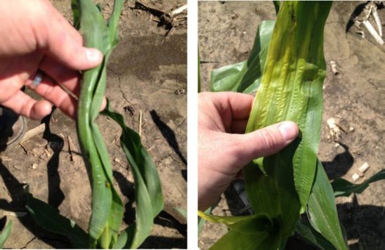 It usually occurs in 5th to 7th leaf corn but can also occur as late as 12th leaf corn.