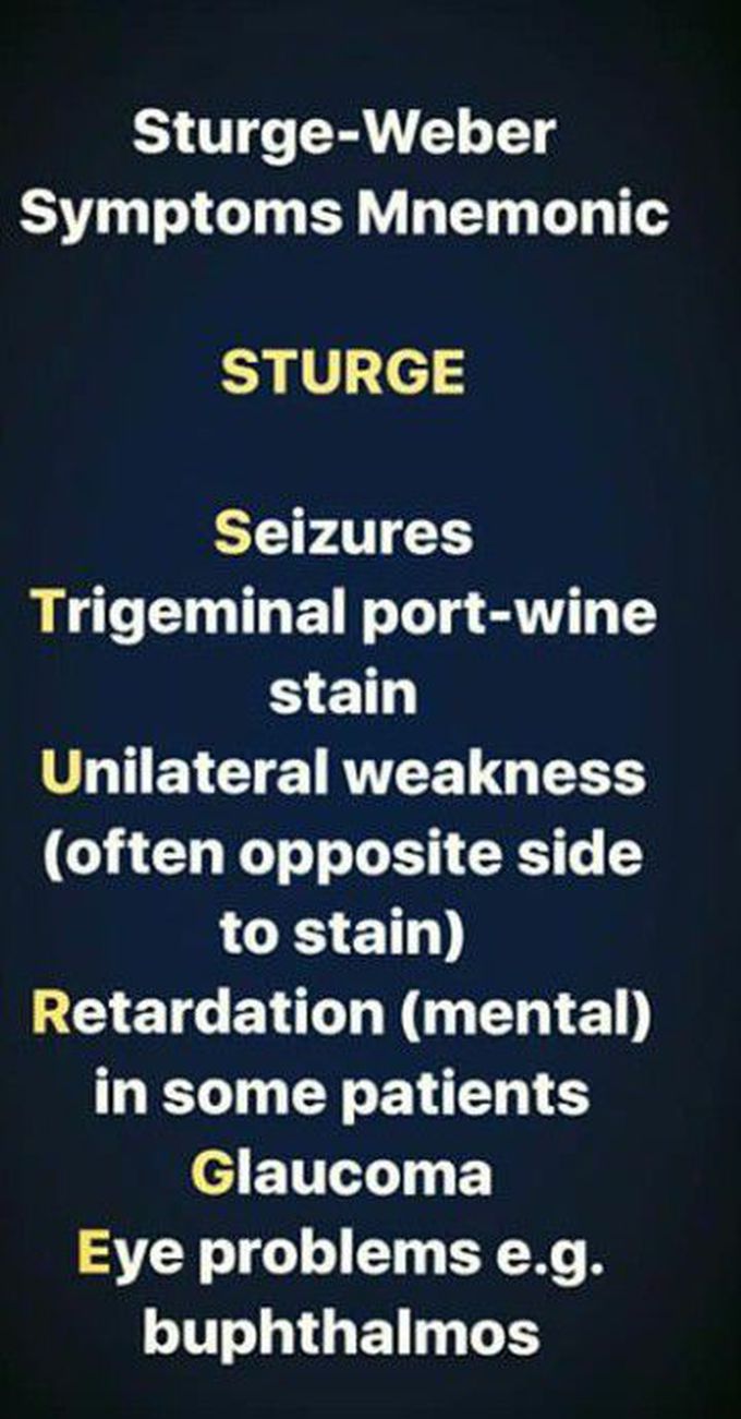 Some key findings pertaining to Sturge-Weber syndrome may be recalled using the following mnemonic. Here is an easy to remember mnemonic for the clinical features of Sturge Weber Syndrome. Neurocutanous disease ---Sturge-Weber syndrome SWS is a neurological disorder marked by a distinctive port-wine stain on the forehead scalp or around the.