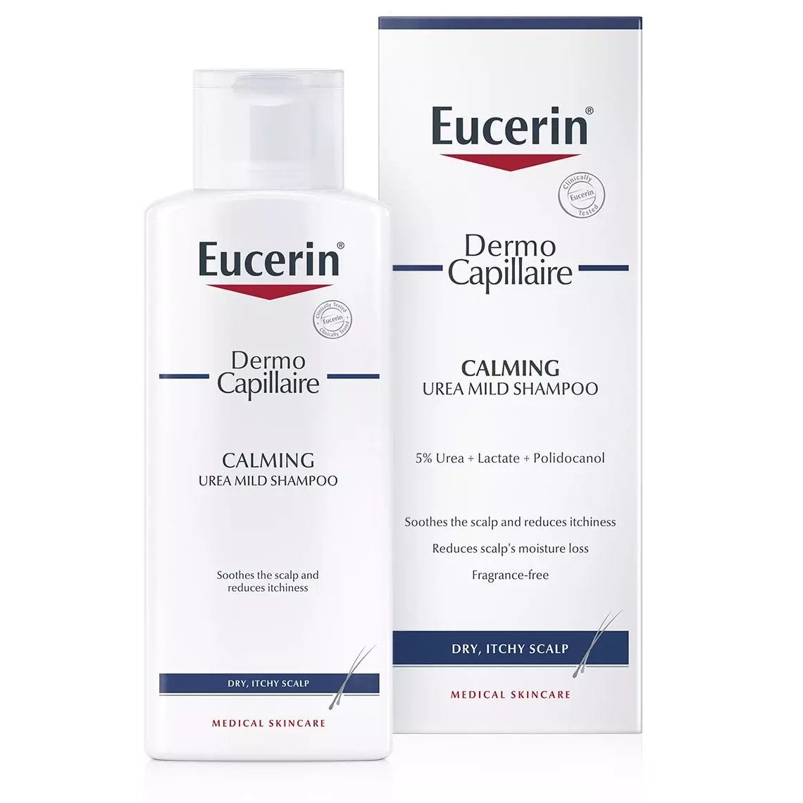 Eucerin DermoCapillaire Calming Urea Shampoo 5 Urea Ideal for a dry and itchy scalp this mild shampoo gently cleanses moisturises and soothes itchiness. Eucerin DermoCapillaire scalp treatment contains key ingredients including Urea and Lactate that help to improve the scalps ability to bind in moisture. New Eucerin DermoCapillaire Calming Urea Scalp Treatment Provides an intensive moisturising calming effect to a dry itchy scalp.