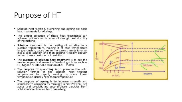 At that point the basket containing the parts is dropped into a quench tank. The solution heat treatment involves heating the alloy to a high enough temperature to drive the alloy - ing elements into solid solution yielding a metastable supersatu - rated solid solution. It is different in so much as the solution as treatment which involves heating the aluminium alloy up to its appropriate solution temperature followed by quenching rapidly this makes the alloy extremely soft.