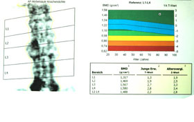 Bei der Knochendichtemessung mittels quantitativer Computertomographie wird mit Hilfe von Röntgenschnittbildern die Knochendichte in der Lendenwirbelsäule gemessen. Welche Messverfahren zur Bestimmung der Knochendichte werden an der Abteilung Nuklearmedizin angewendet. Anhand von Referenzmodellen läßt sich dann über den Grad der Röntgenstrahlen-Abschwächung der Knochendichtewert der T-Wertermitteln.