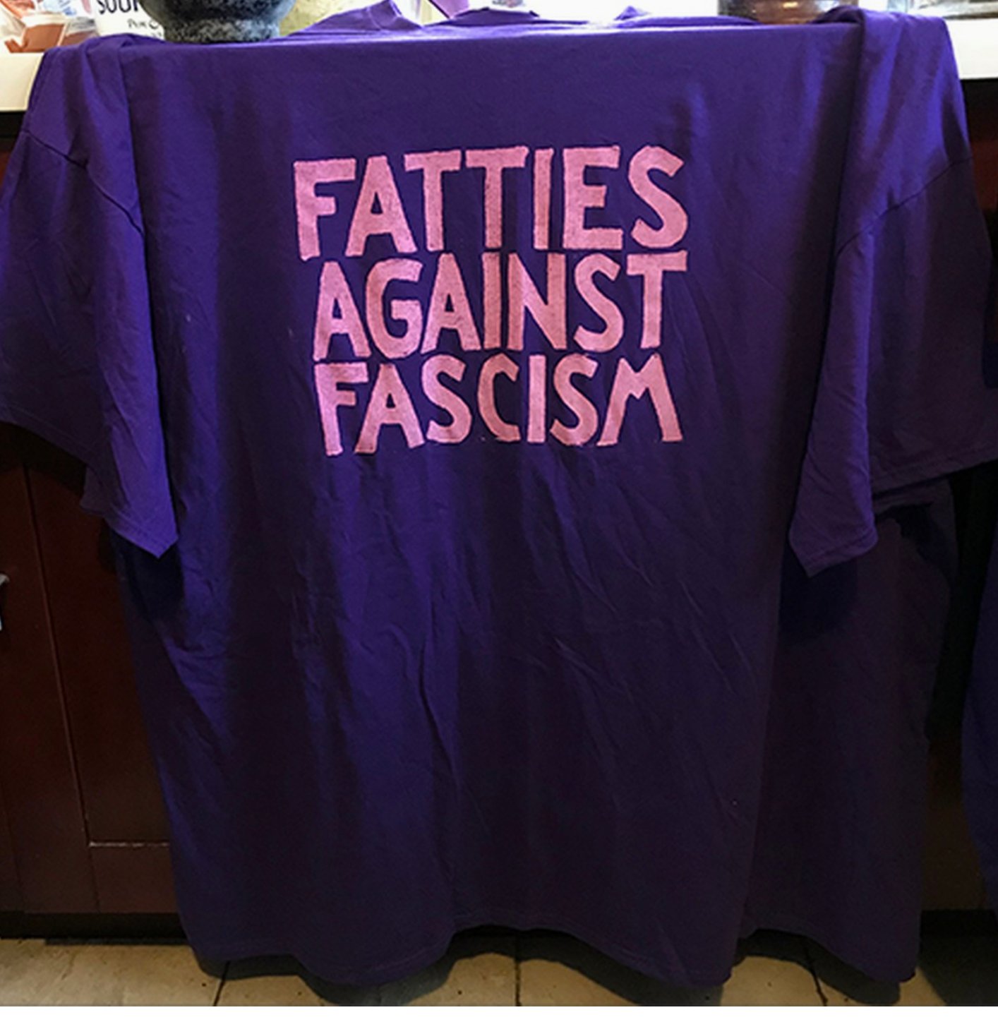 Shop fatties against fascism merch created by independent artists from around the globe. Im not affiliated with the makers of the Fatties Against Fascism shirts other than loving their work I paid full price for my shirts from them and dont get compensated for linking to their site or for any purchases. Check out our against fascism selection for the very best in unique or custom handmade pieces from our shops. 0730 Subido 2409 a las 213255 28823203. Are you a fat person who wants to participate in anti-fascism actions. Hand block-printed 100 cotton unisex t-shirts in sizes L-9X. Check out our against fascism selection for the very best in unique or custom handmade pieces from our t-shirts shops. Two different shades of purple shirts with block letters in peach ink that say Fatties Against Fascism. Other than the shirt I wont be compensated for the campaign and I dont get compensated for linking to their site or for any purchases made there.