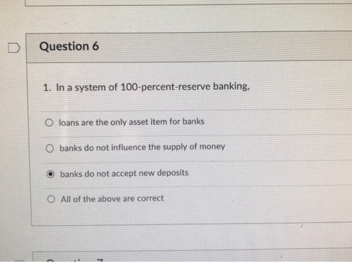 In a system of 100-percent-reserve banking. 2 question In a system of 100-percent-reserve banking Select one. M1 would not change. Banks do not make loans.